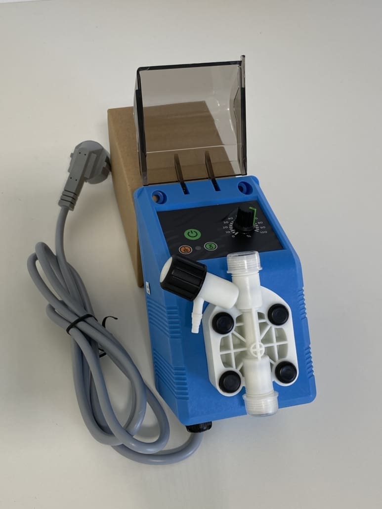 Esta bomba dosificadora azul de 230V es ideal para la dosificación precisa de productos en saunas, spas y otros entornos de bienestar.